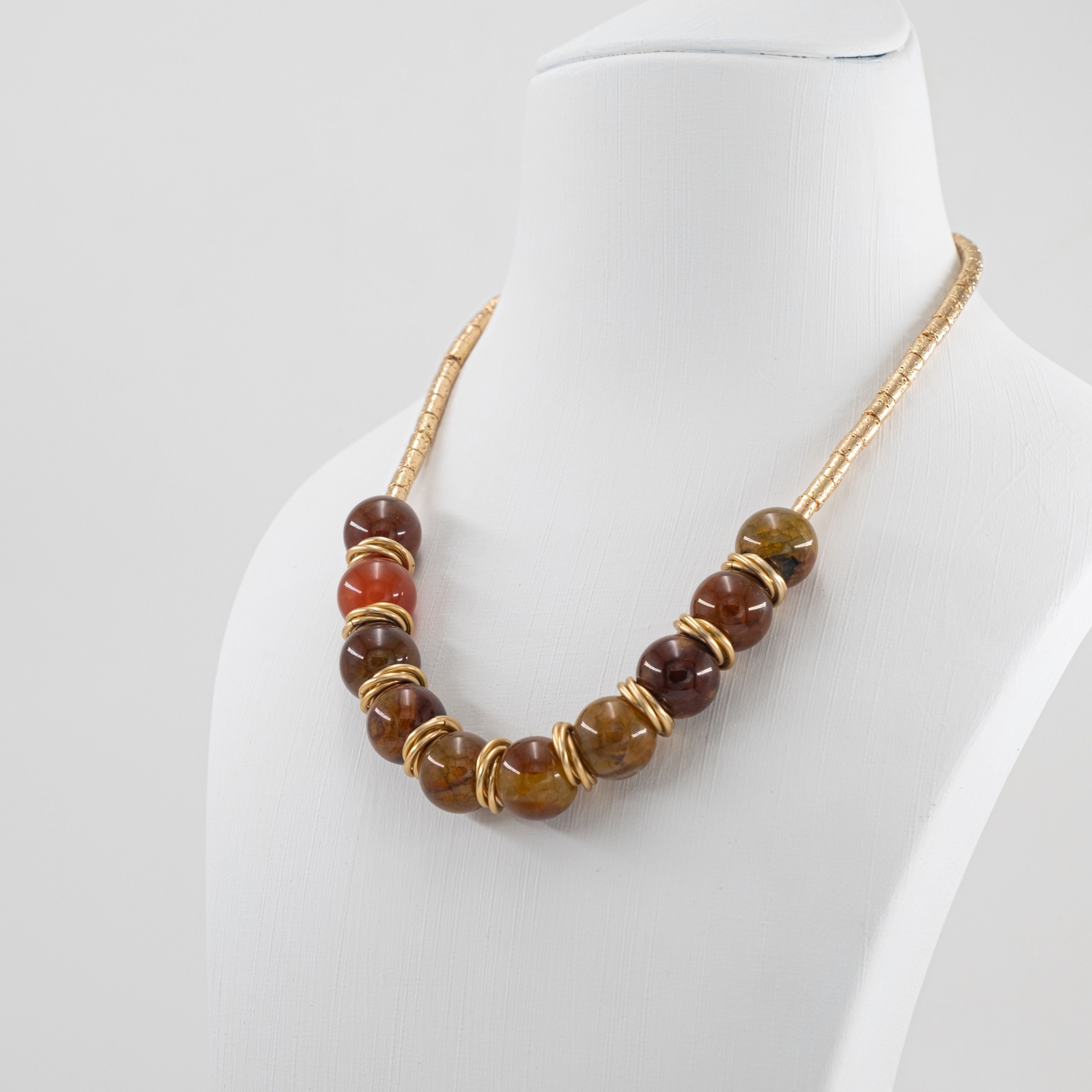 Gold lav taşı ve akik taşlarının sıcak tonları, güçlü formuyla bir araya geliyor. Modern ama karakterli bir tasarım.