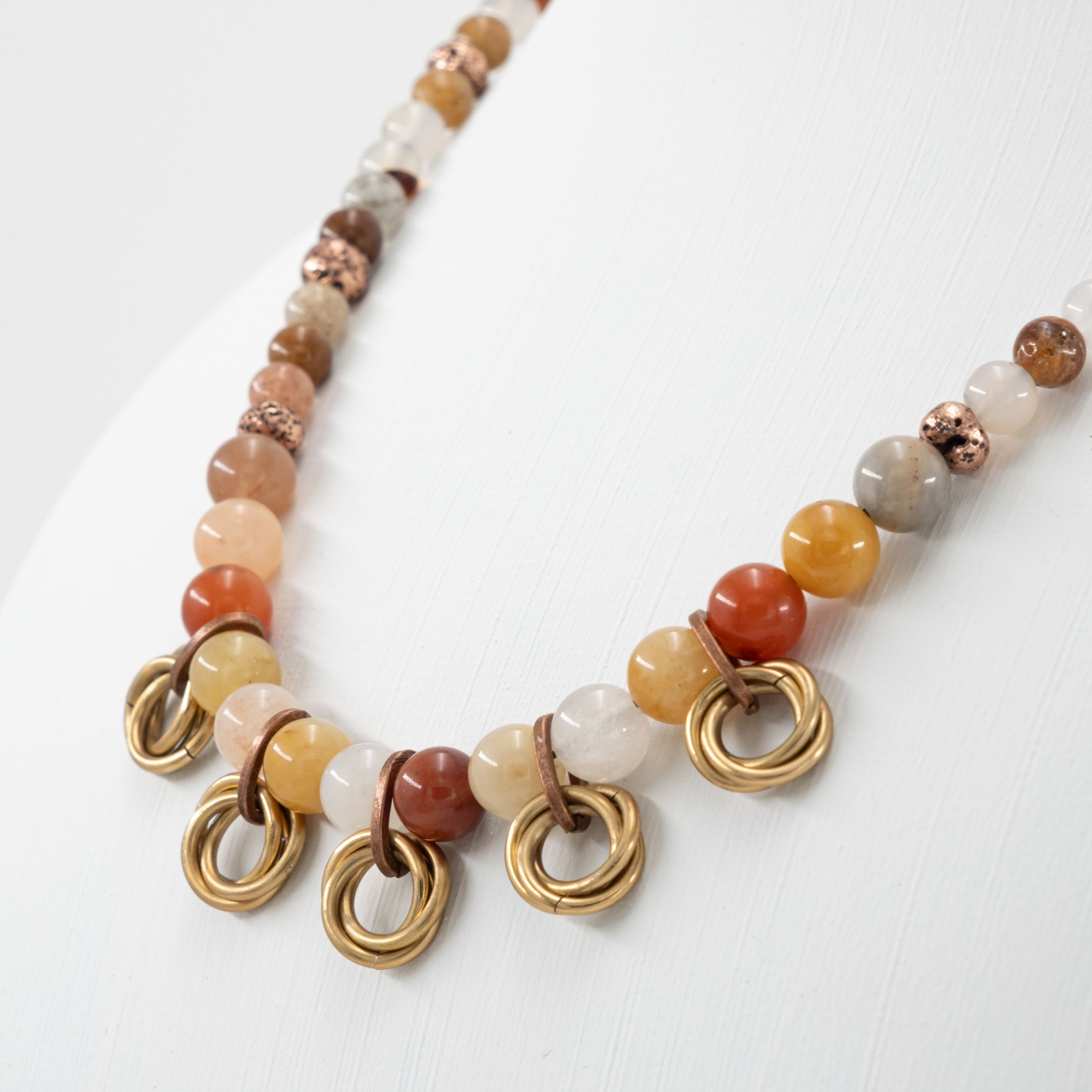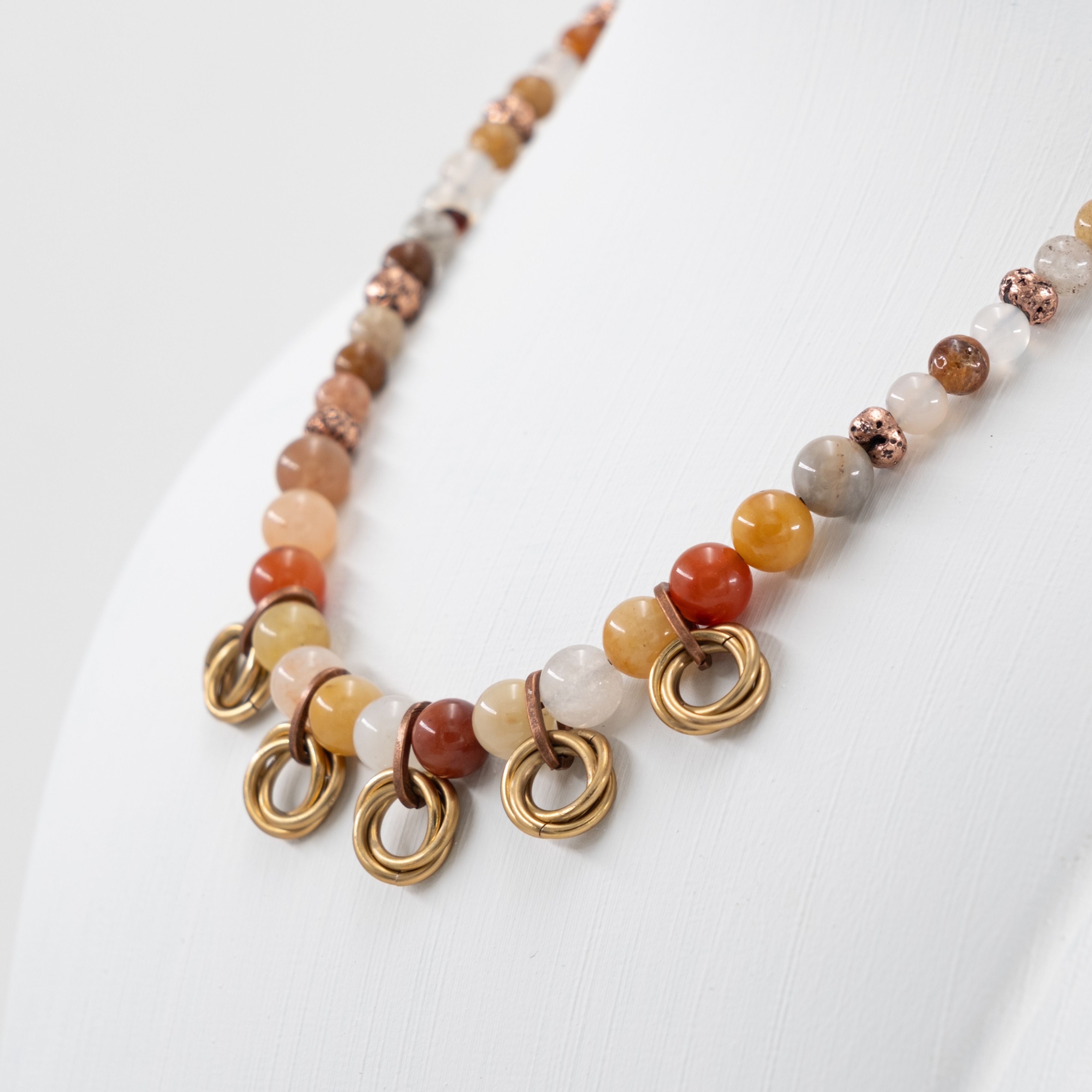 Akik taşlarının sıcak tonları, bronz örgü zırhın güçlü formuyla birleşiyor. Akışkan formlar ve belirgin detaylar, dengeli ve zamansız bir görünüm sunuyor.