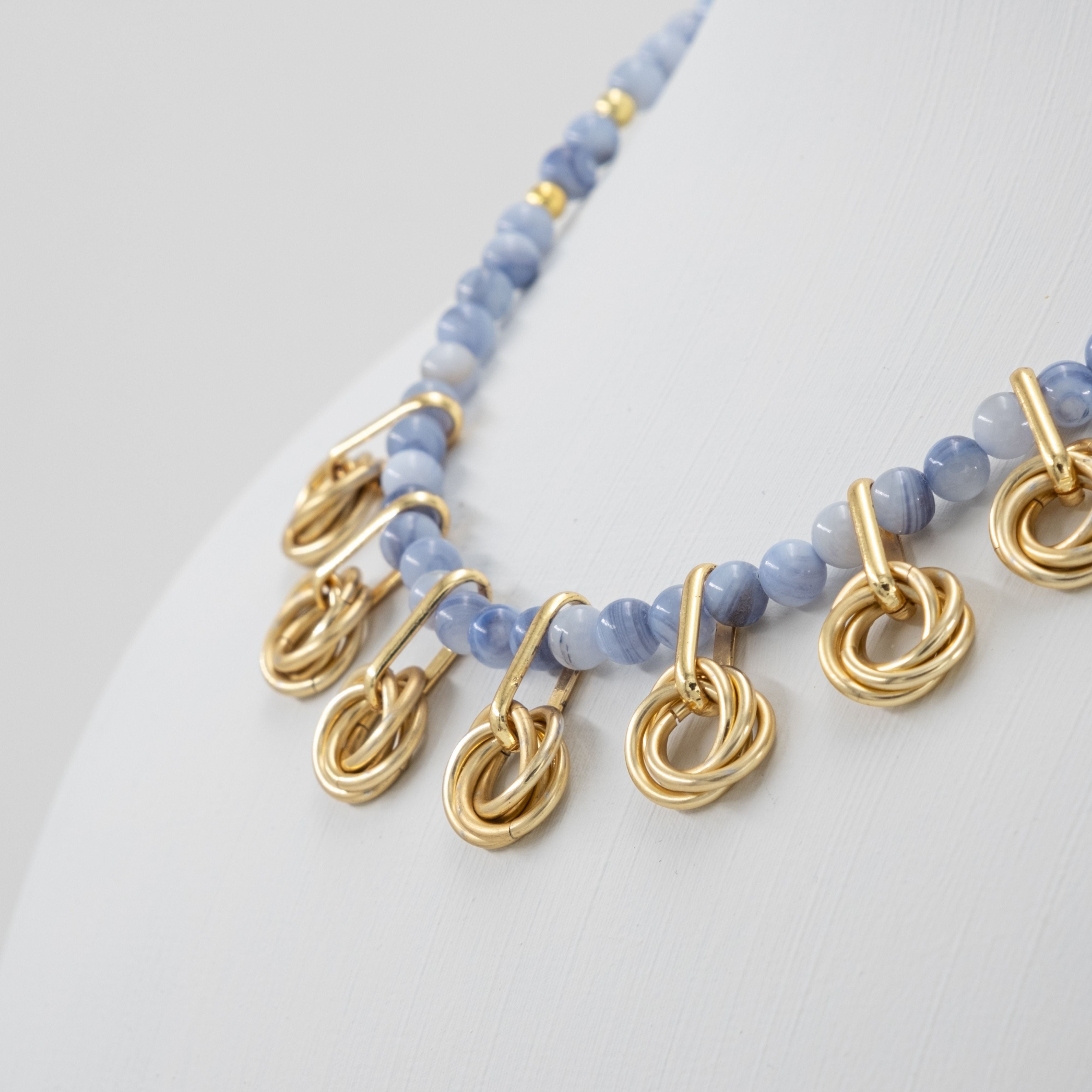 Mavi sedef taşları ve gold örgü zırh detayları bir araya gelerek dengeli ve modern bir görünüm sunar