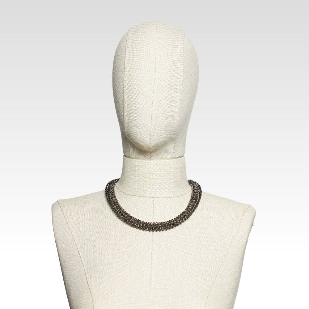 Her halkası elde tek tek birleştirilerek örülmüş olan bu yapı, yalnızca görsel değil, dokunsal olarak da yoğun ve sağlam bir his sunar.