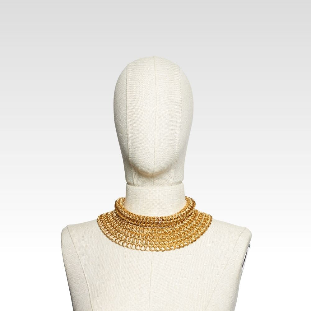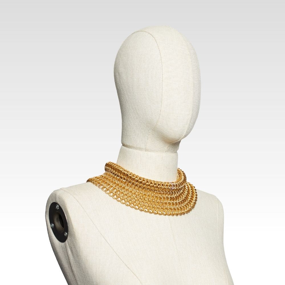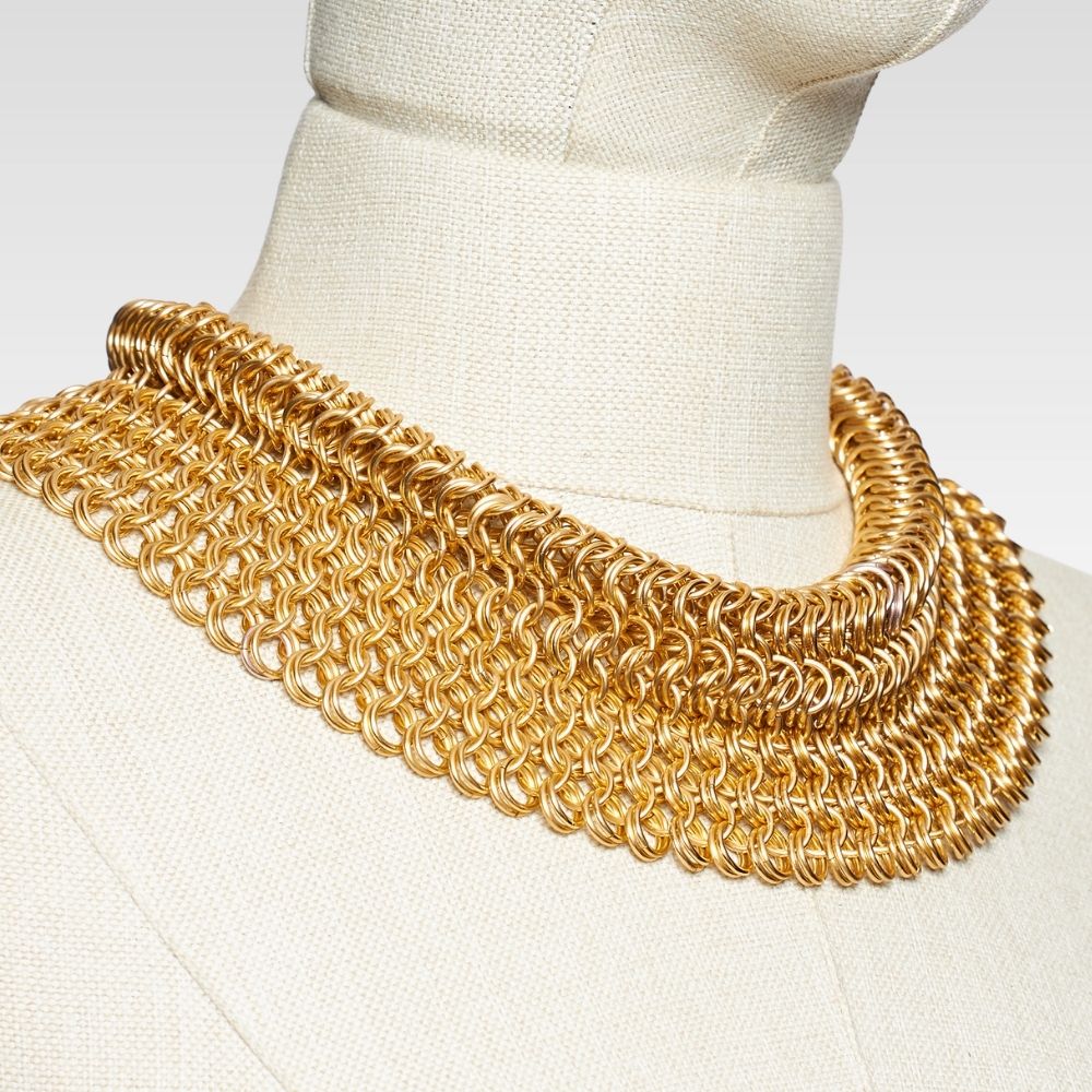 Bu örgü zırh yaka kolye, bronz tonlu alüminyum halkaların bir araya getirilmesiyle oluşturuldu. Antik formlardan ilham alsa da bugünün diliyle konuşan bir tasarım.