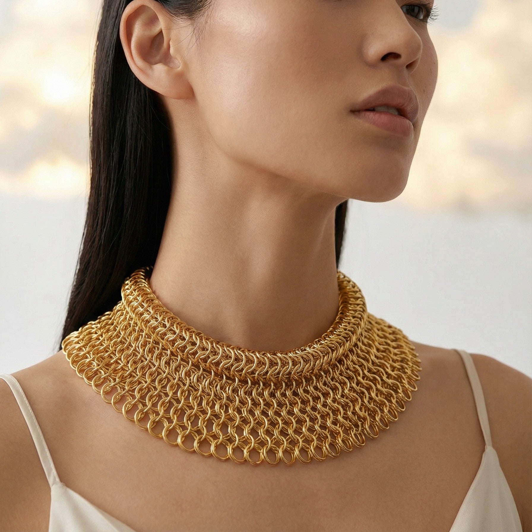 Her bir halka tek tek örülerek oluşturulan bu yapı, boyun çevresine adeta bir çerçeve gibi oturur. Abartıya ihtiyaç duymaz; duruşu yeterlidir.