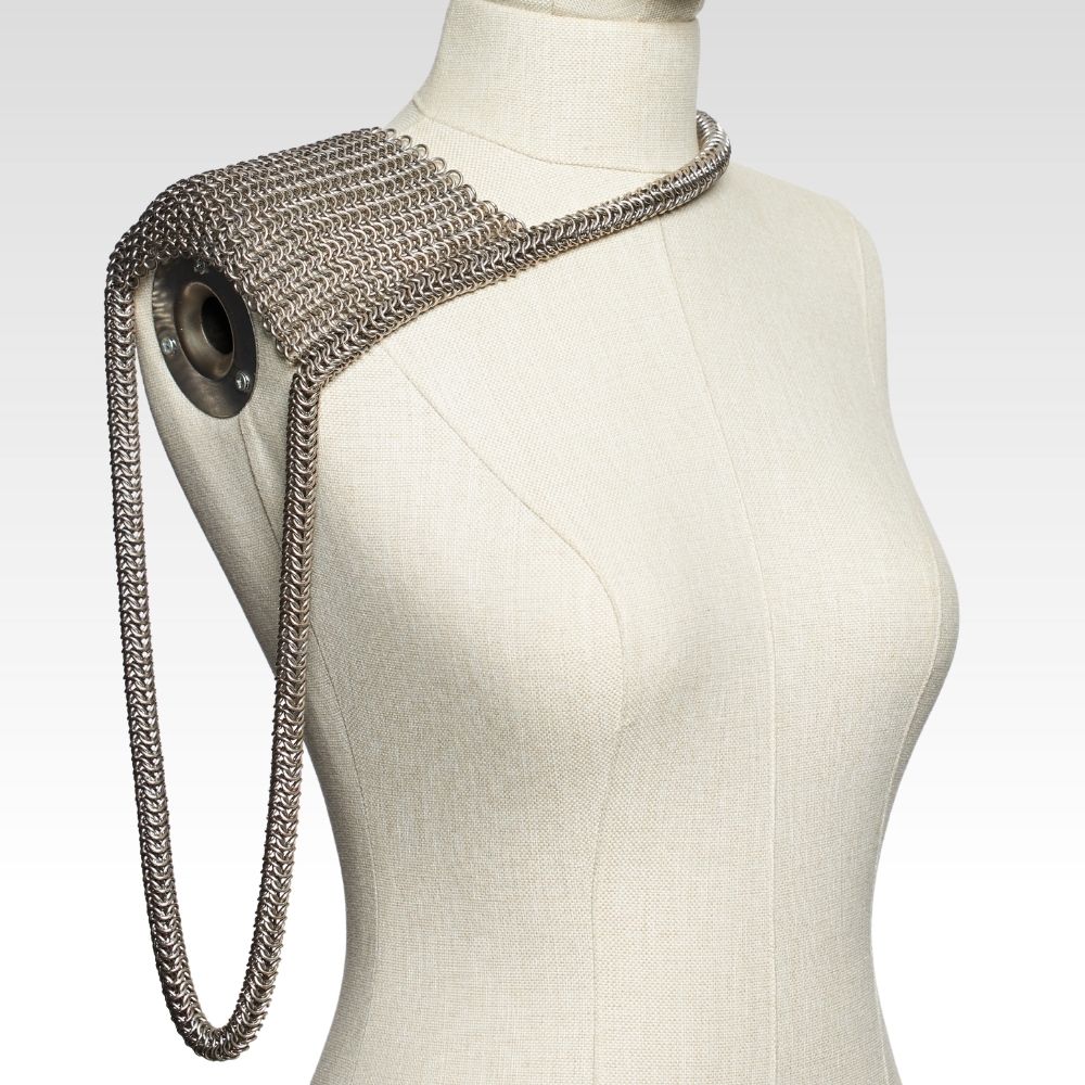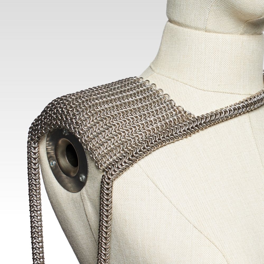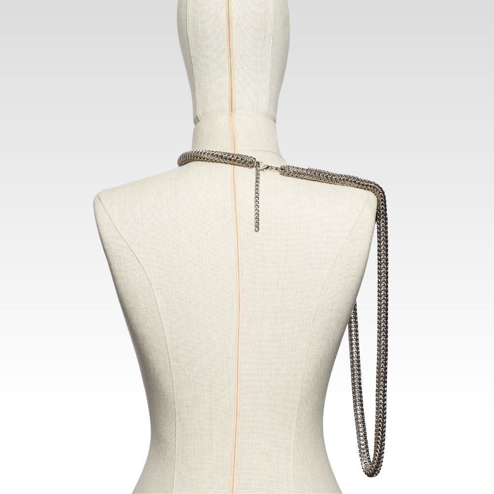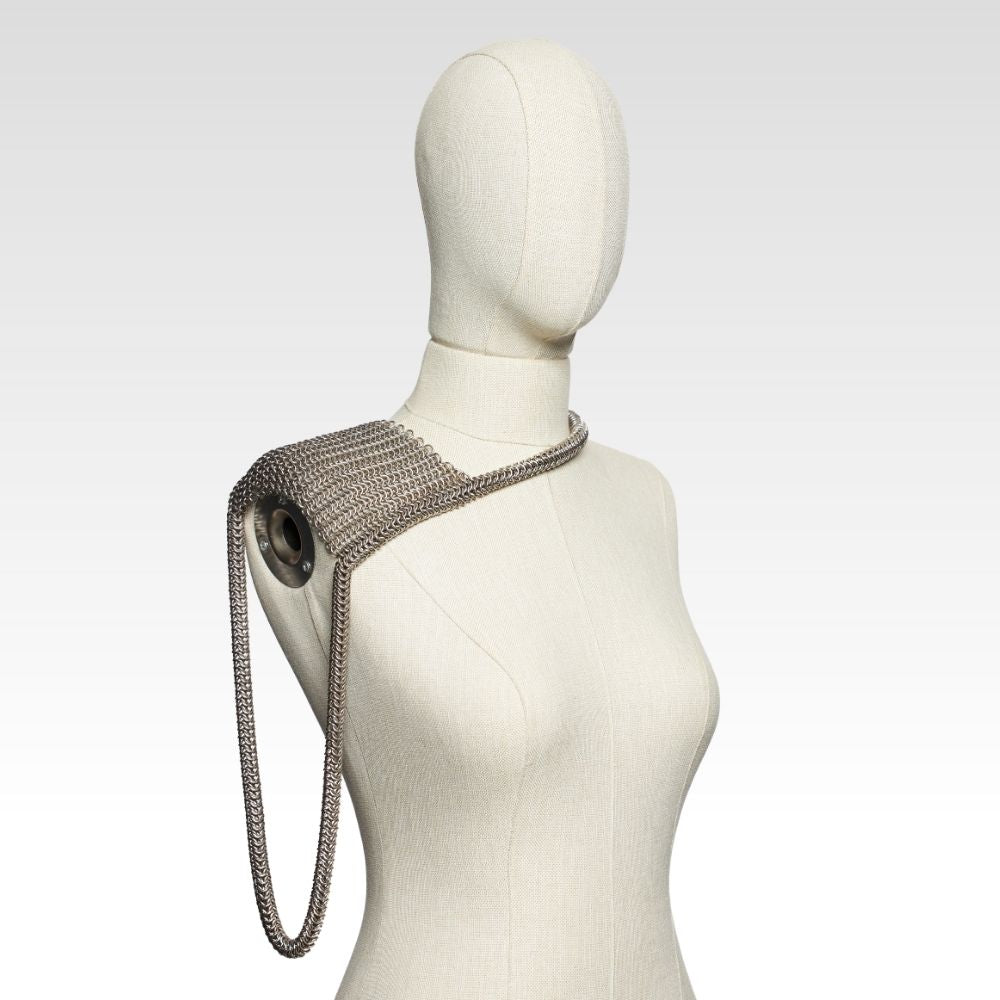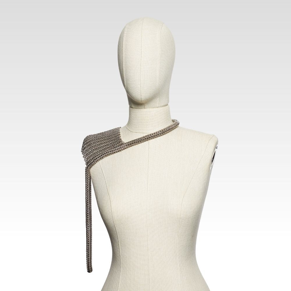 Bu örme zırh omuz aksesuarı, antik zırh estetiğinden ilhamla hazırlanmış, modern ama tarihsel bir parçadır. Geniş omuz paneli ve çapraz boyun geçişli formu sayesinde hem figürü vurgular hem de dikkat çeker.